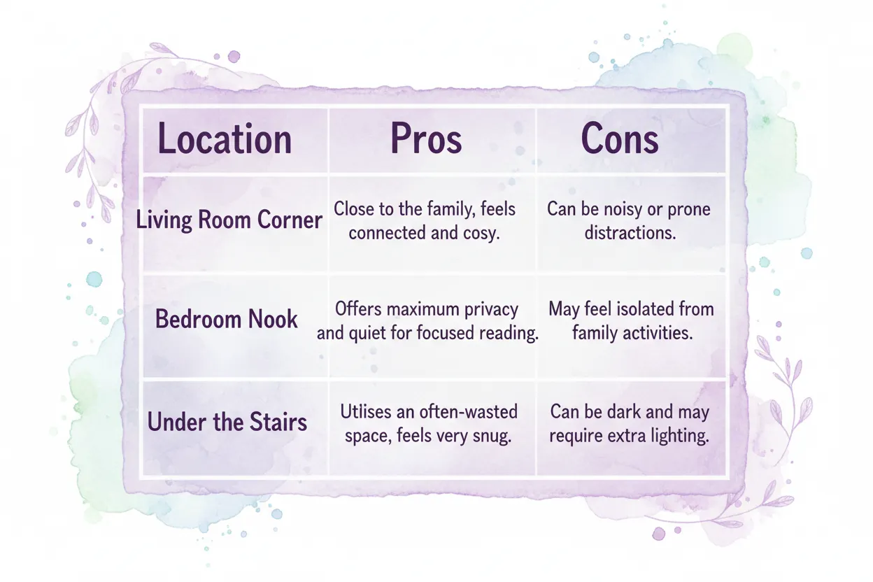 Think about the primary purpose of the space. Will it be a quiet retreat for one person or a cosy spot for family read alouds? Your answer will help determine the best location. A cosy atmosphere begins with a spot that feels private and sheltered, making it easier to relax and focus.