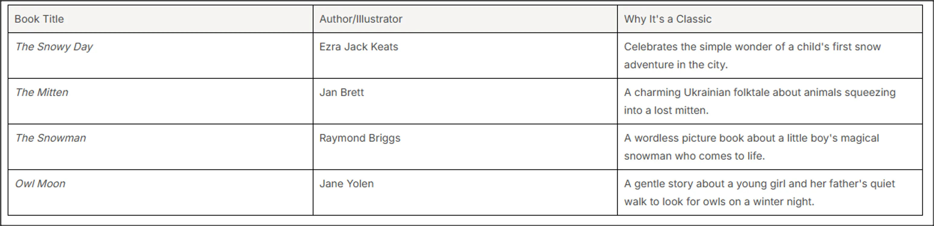 Other stories, like The Mitten by Jan Brett, offer a humorous and heartwarming look at animal friends seeking shelter from the cold. These tales are perfect for introducing young children to the concept of the seasons and the kindness that winter can inspire. They are foundational for any list of winter books.
